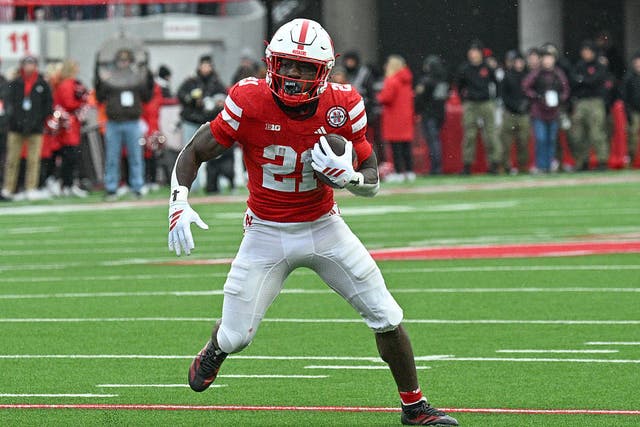 Emmett Johnson #21 of the Nebraska Cornhuskers runs against the Iowa Hawkeyes during the first half at Memorial Stadium on November 28, 2025 in Lincoln, Nebraska. (Photo by Steven Branscombe/Getty Images)