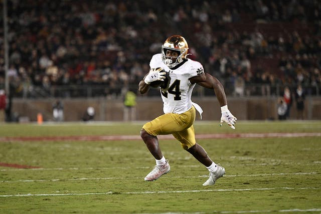 Jadarian Price #24 of the Notre Dame Fighting Irish runs the ball against the Stanford Cardinal in the first quarter at Stanford Stadium on November 29, 2025 in Stanford, California. (Photo by Eakin Howard/Getty Images)