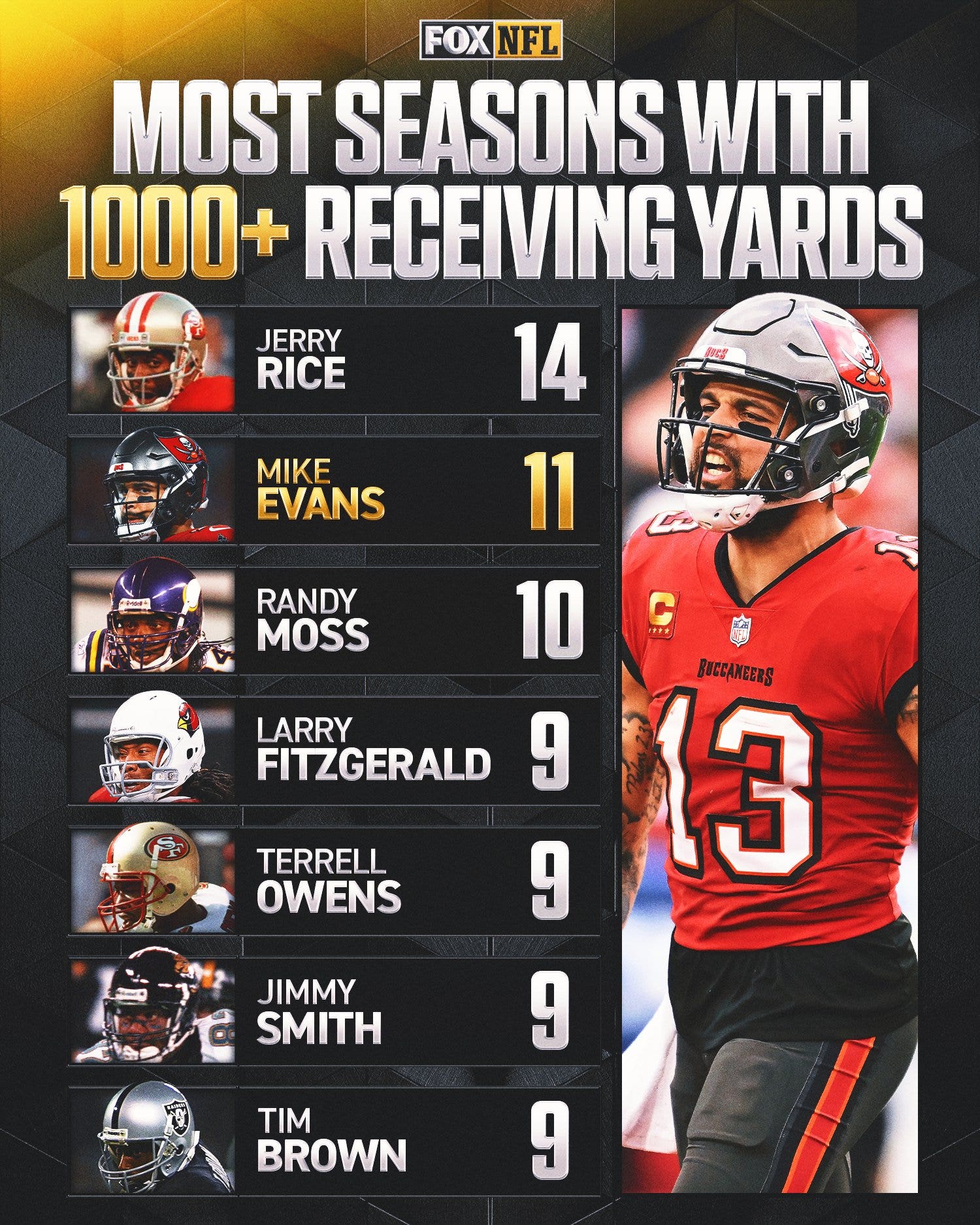 While Evans’ streak of 1,000-yard seasons ended in 2025, he’s still set to be one of the top free agents this offseason. He came in at No. 15 on my top 100 NFL free agents list earlier in the offseason, ranking third among the wide receivers set to become available.