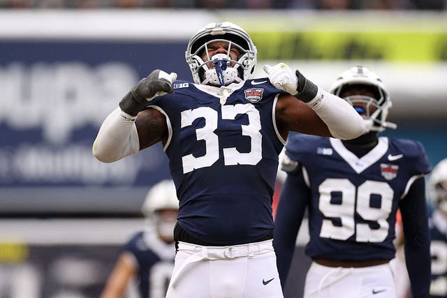 Dani Dennis-Sutton #33 of the Penn State Nittany Lions reacts after his second quarter sack against the Clemson Tigers during the 2025 Bad Boy Mowers Pinstripe Bowl at Yankee Stadium on December 27, 2025 in New York City. (Photo by Evan Bernstein/Getty Images)
