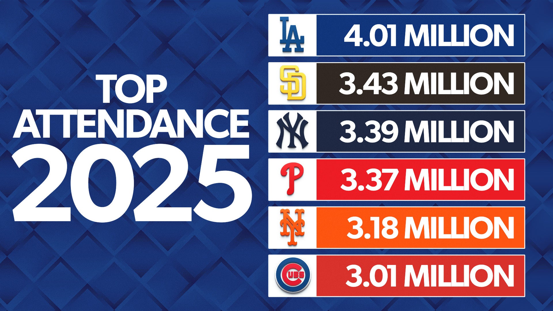 In total, the Dodgers concluded the 2025 regular season with an attendance of 4,012,470, passing their previous high set in 2019 (3,974,309). They averaged 49,537 fans per game. The Padres, who also set an all-time overall attendance mark, ranked second in both categories at 3,392,129 total and 42,401 per night.