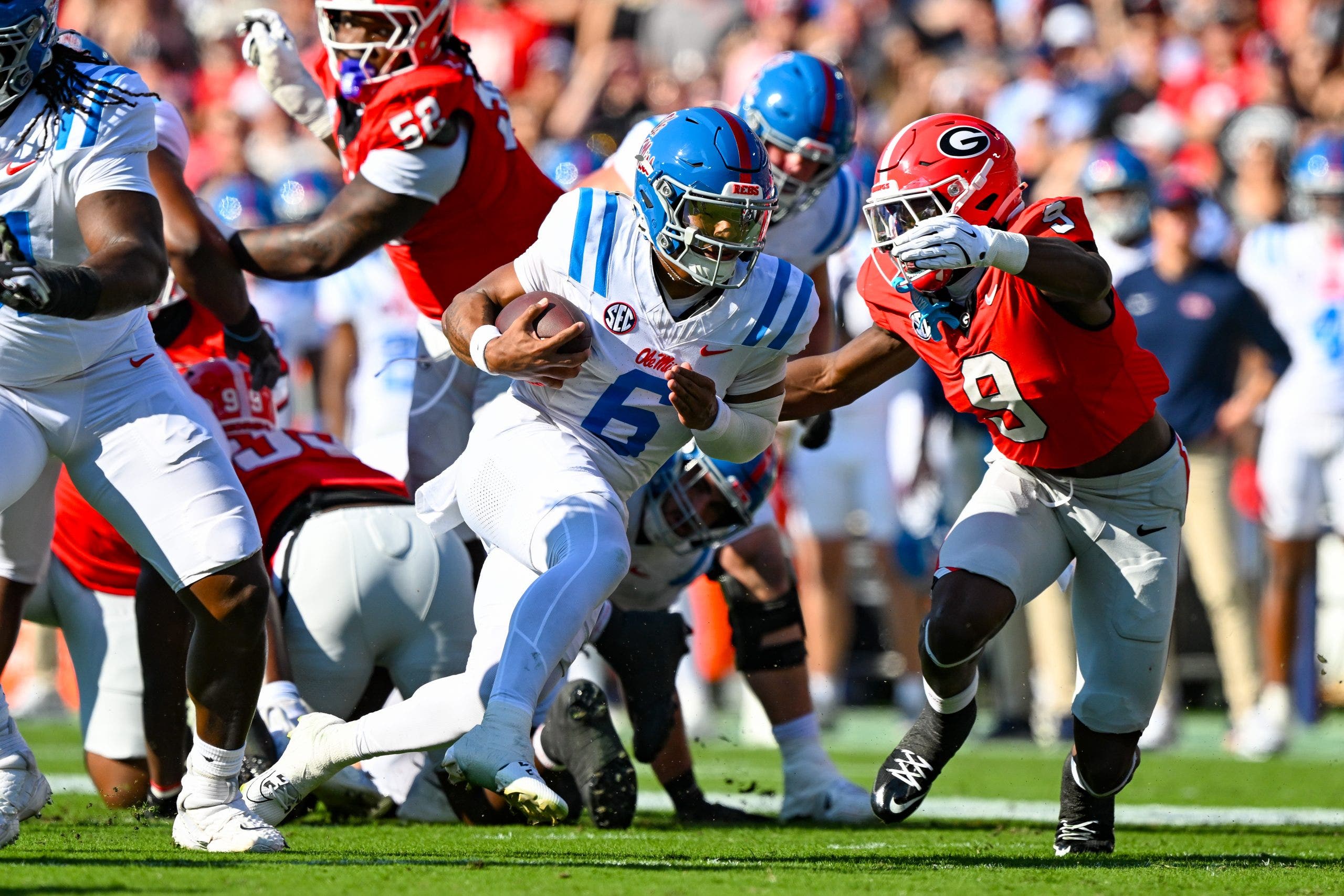 ATHENS, GA – OCTOBER 18:  Ole Miss quarterback Trinidad Chambliss (6) runs the ball during the college football game between the Ole Miss Rebels and the Georgia Bulldogs on October 18th, 2025 at Sanford Stadium Bobby Dodd Stadium in Athens, GA.  (Photo by Rich von Biberstein/Icon Sportswire via Getty Images)