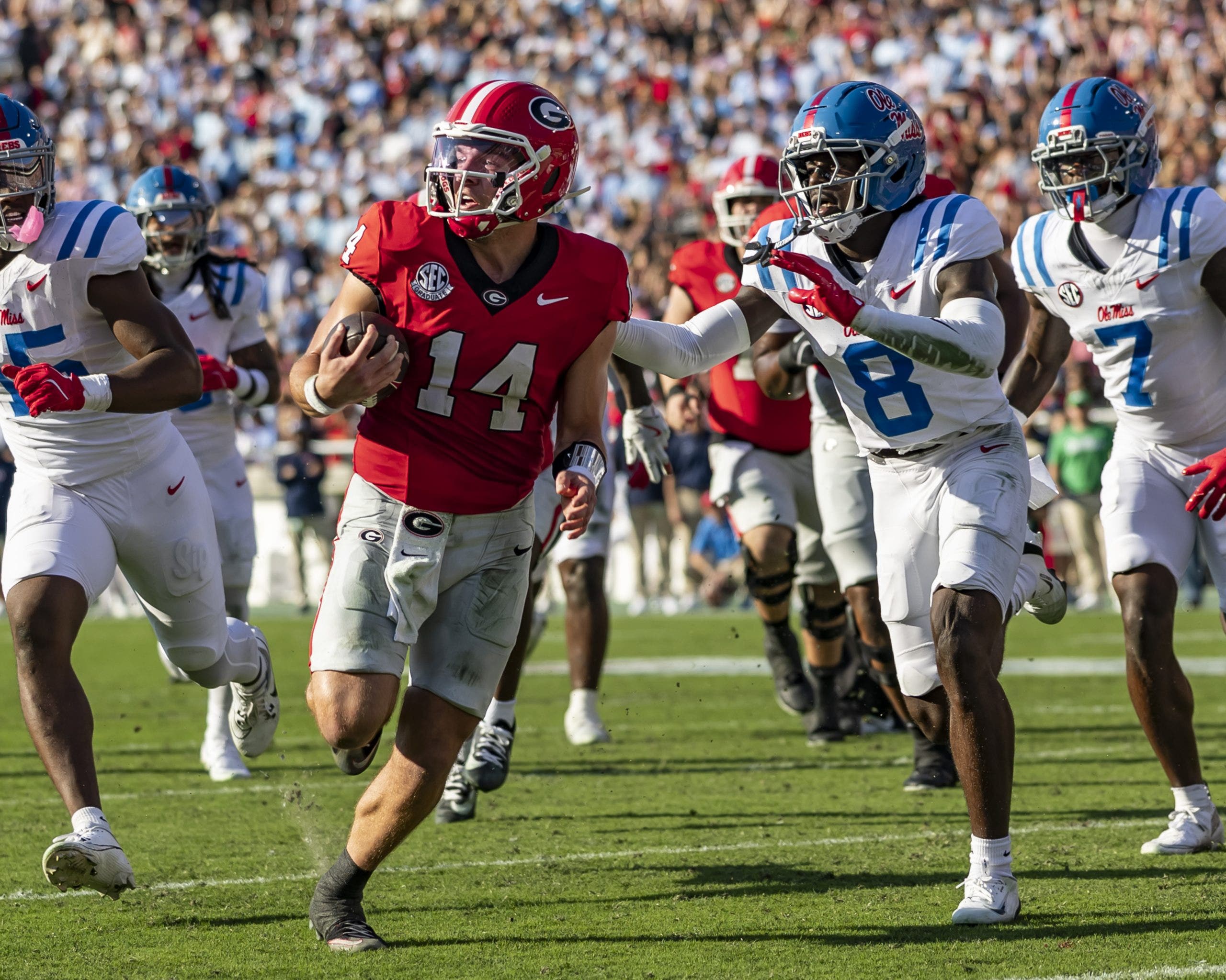 ATHENS, GEORGIA – OCTOBER 18: Gunner Stockton #14 of the Georgia Bulldogs runs for Georgia’s second touchdown during the game between the Ole Miss Rebels and the Georgia Bulldogs at Sanford Stadium on October 18, 2025 in Athens, Georgia. (Photo by Steve Limentani/ISI Photos/ISI Photos via Getty Images)