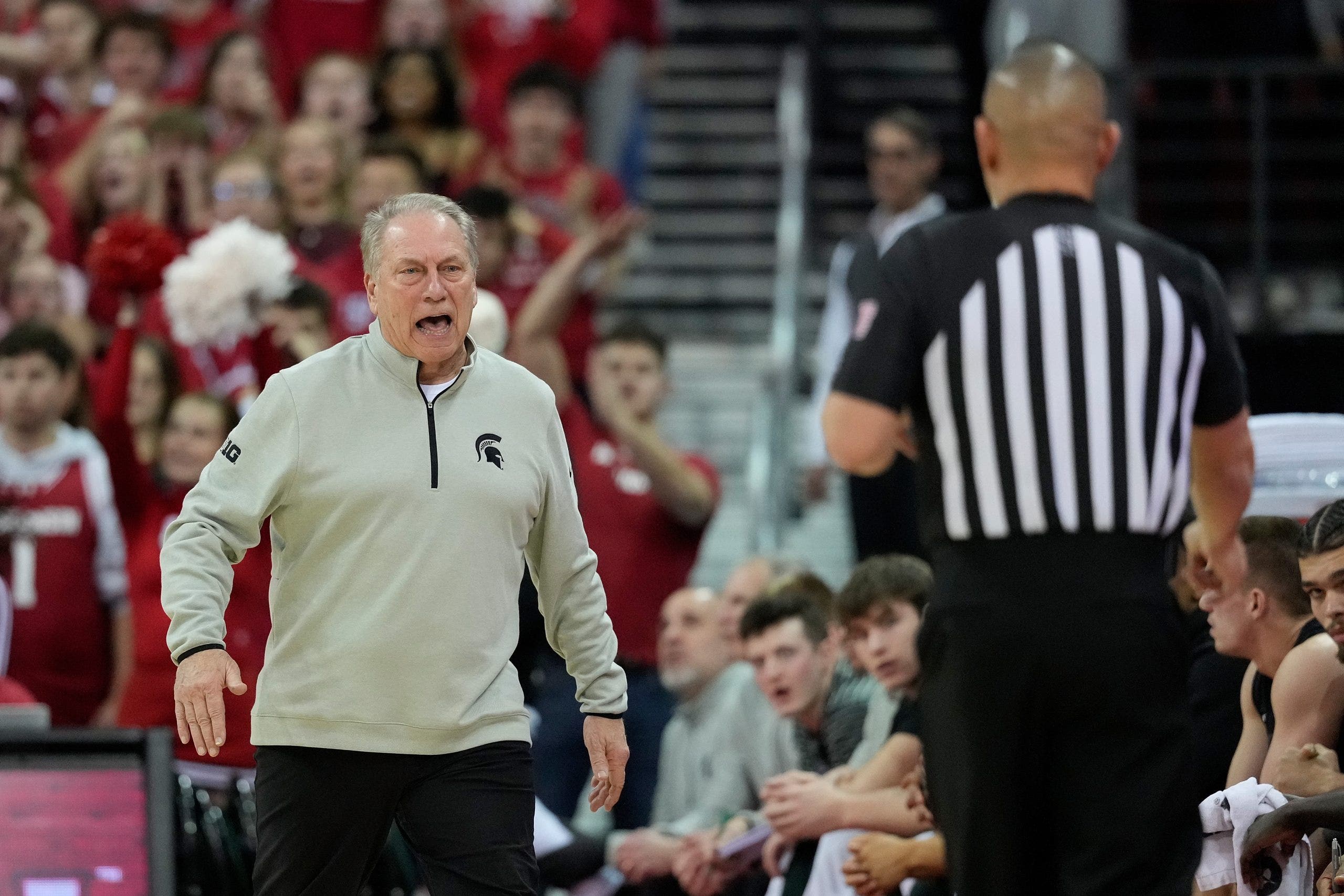 Michigan State head coach Tom Izzo argues a call against the Wisconsin Badgers. (Photo by John Fisher/Getty Images)