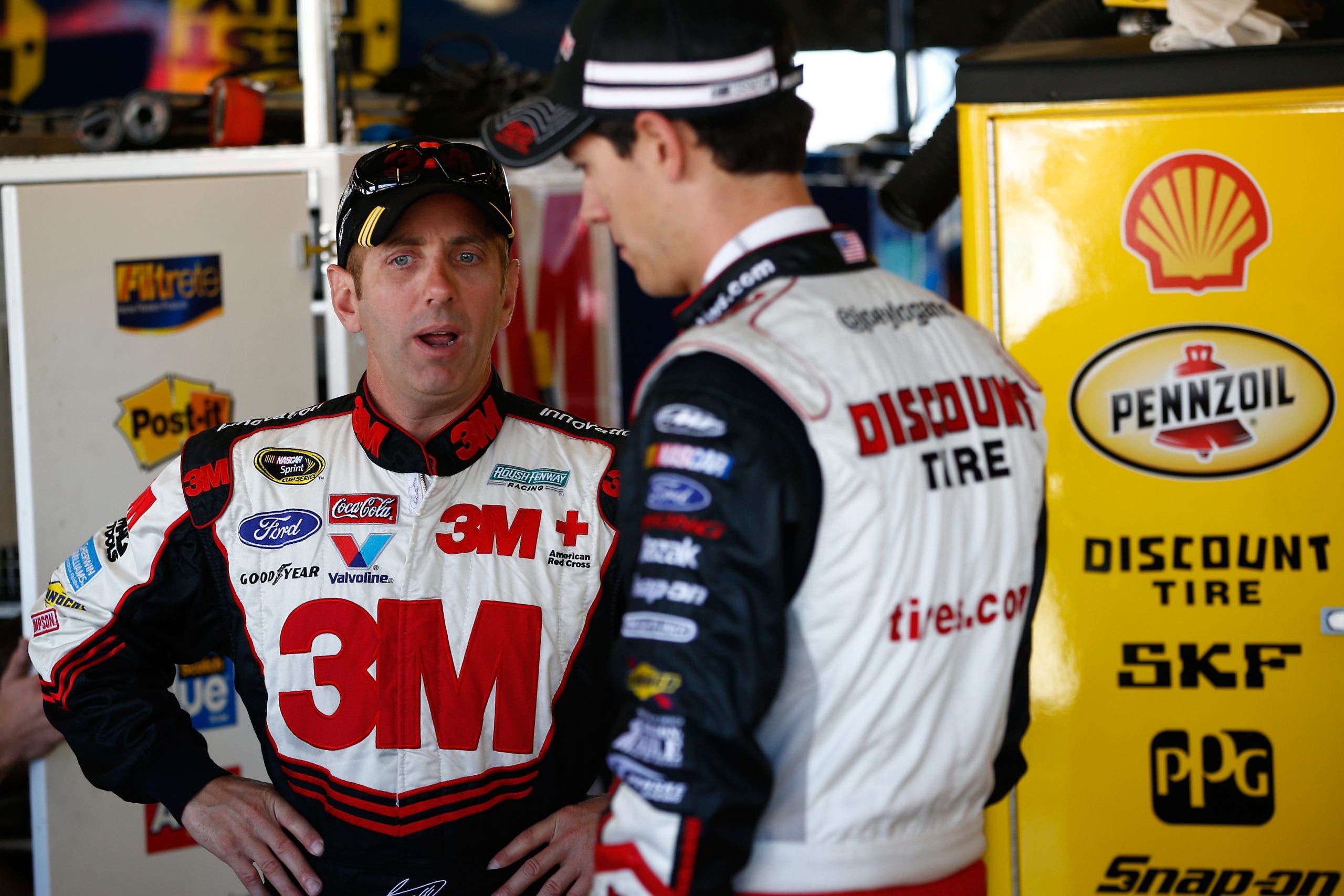 Greg Biffle (L) and Joey Logano during practice for the NASCAR Sprint Cup Series Geico 400 in 2013.