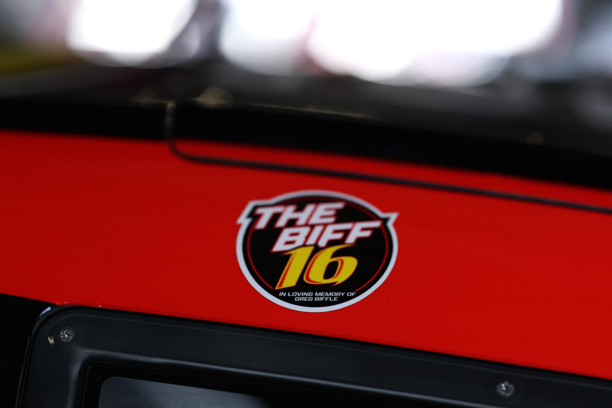 A detailed view of “The Biff 16” sticker in tribute to Greg Biffle during qualifying for the NASCAR O’Reilly Auto Parts Series United Rentals 300 at Daytona International Speedway.