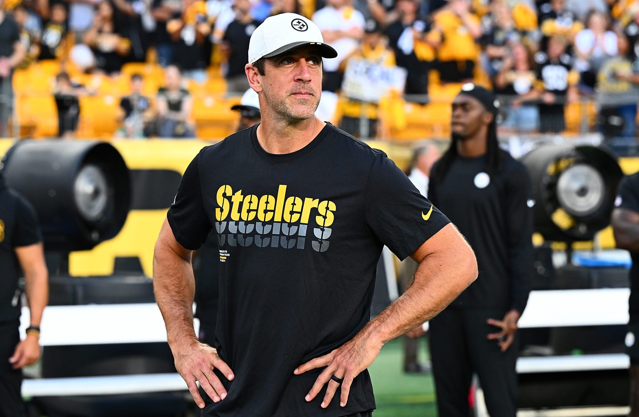 Aaron Rodgers #8 of the Pittsburgh Steelers looks on during the NFL Preseason 2025 game against the Tampa Bay Buccaneers at Acrisure Stadium on August 16, 2025 in Pittsburgh, Pennsylvania. (Photo by Joe Sargent/Getty Images)