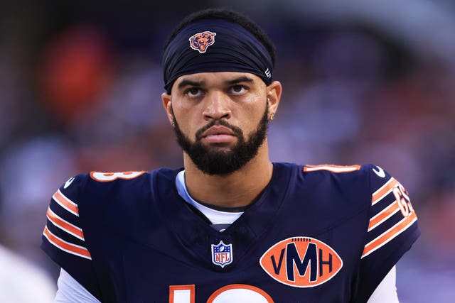 Caleb Williams looks on during the NFL Preseason 2025 game between the Buffalo Bills and the Chicago Bears at Soldier Field on August 17, 2025 in Chicago, Illinois. (Photo by Geoff Stellfox/Getty Images)