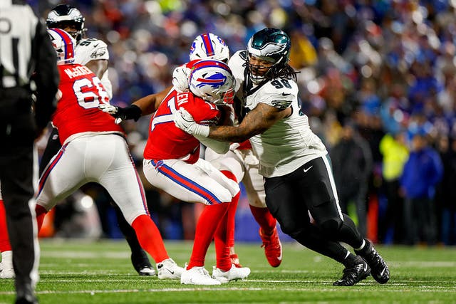 That’s what happened on Sunday. The game may have become “gritty” down the stretch, but for most of the time it was shellacking being delivered by the Philly defenders. Jalen Hurts and the offense staked the Eagles to an early 13-0 lead, and the defense wasn’t letting the Bills up for air. They were, in their own words, “relentless” in their pursuit of Bills quarterback Josh Allen, sacking him five times — his second-worst total of the season. And they held the No. 1 rushing team in the NFL to 120 yards on the ground, nearly 40 below their season average.