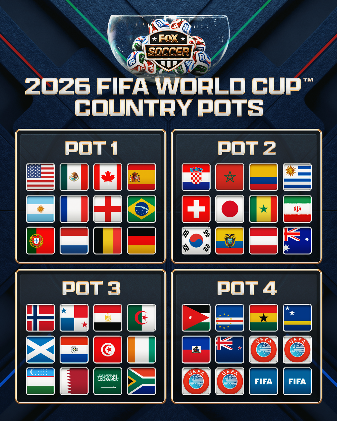As you see, teams like Spain (led by Barcelona youngster Lamine Yamal) and defending champion Argentina (featuring superstar Lionel Messi) rule the latest rankings. Those two teams – along with France, England, Brazil and Cristiano Ronaldo’s Portugal – will be among the heavy favorites next summer. Now let’s move on to the pots: