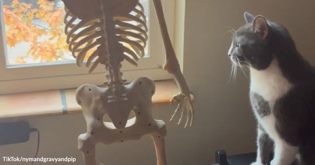 Cuddle-obsessed Cat Befriends 3-Foot Plastic Skeleton
